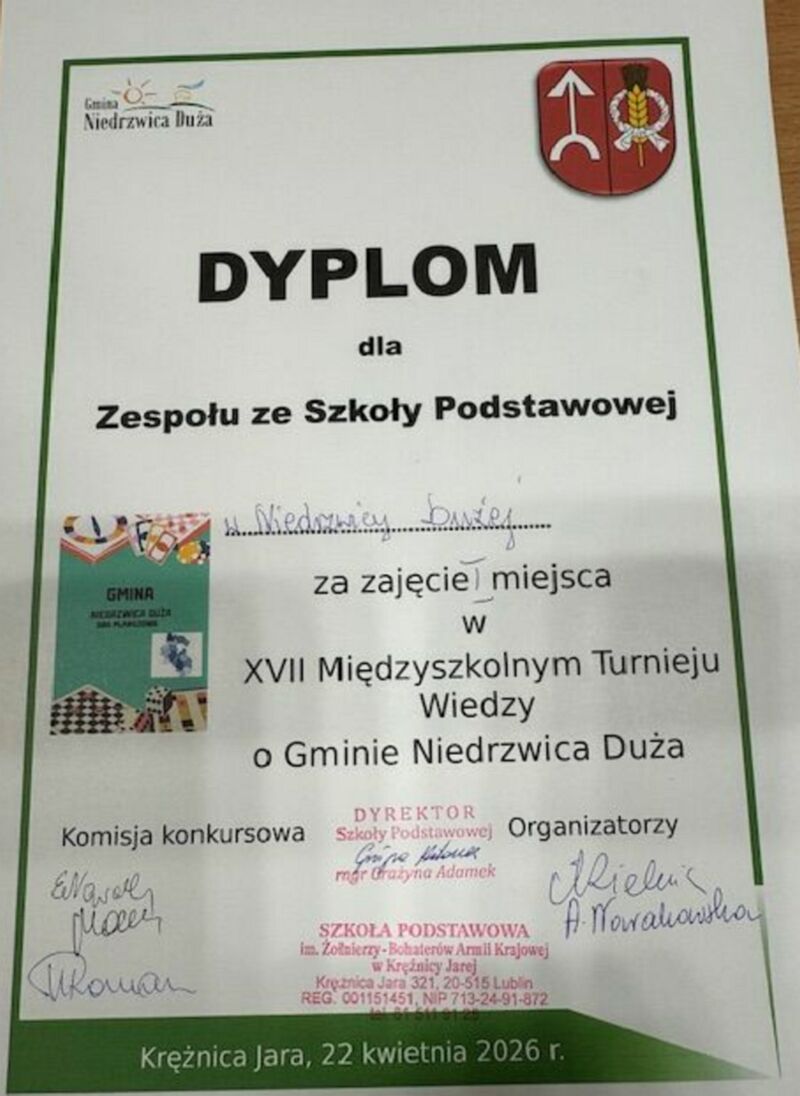 Miło nam poinformować, że 22 kwietnia 2026 roku drużyna z naszej szkoły w składzie: Alicja Czarnecka (VI a), Kacper Pawlak (VIII c) oraz Szymon Król (VIII c) zajęła I miejsce w XVII Międzyszkolnym Turnieju Wiedzy o Gminie Niedrzwica Duża „Czy znasz swoją Gminę?”, który odbył się w Szkole Podstawowej w Krężnicy Jarej. Uczniowie wykazali się dużą wiedzą z różnych dziedzin życia naszej gminy oraz samodzielnie przygotowali i w bardzo ciekawy sposób zaprezentowali grę planszową o naszej gminie.